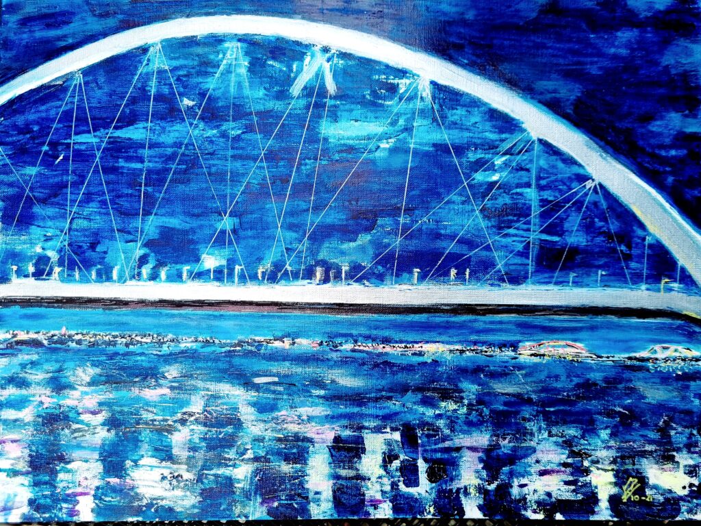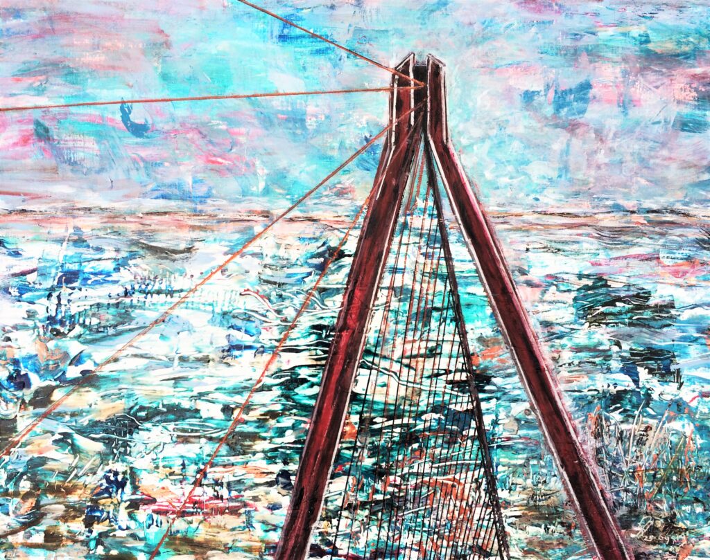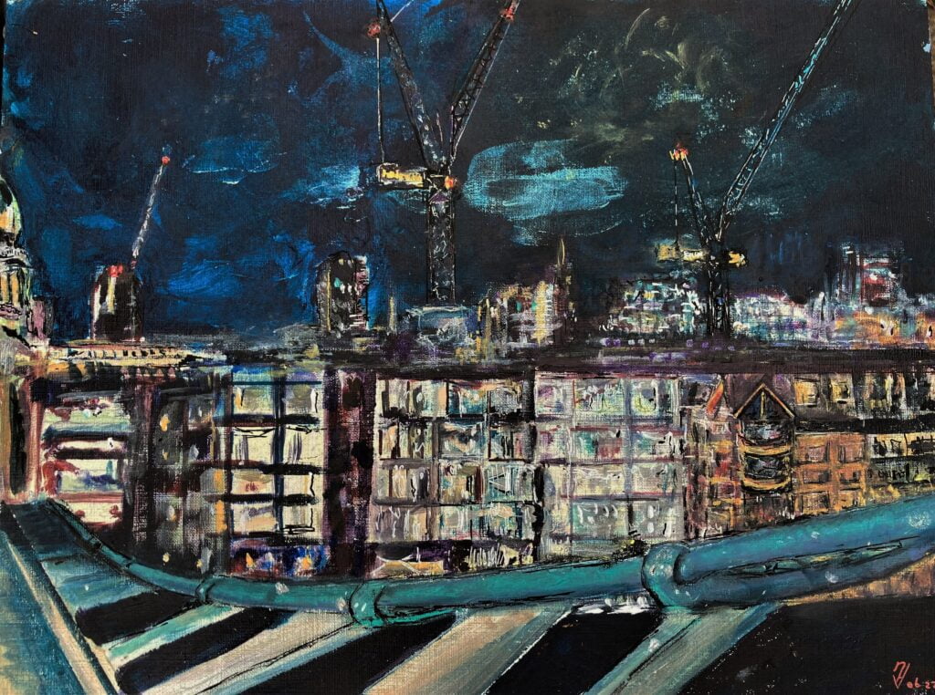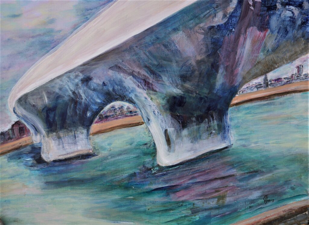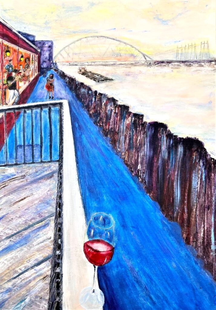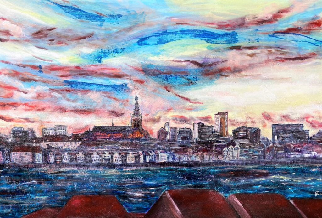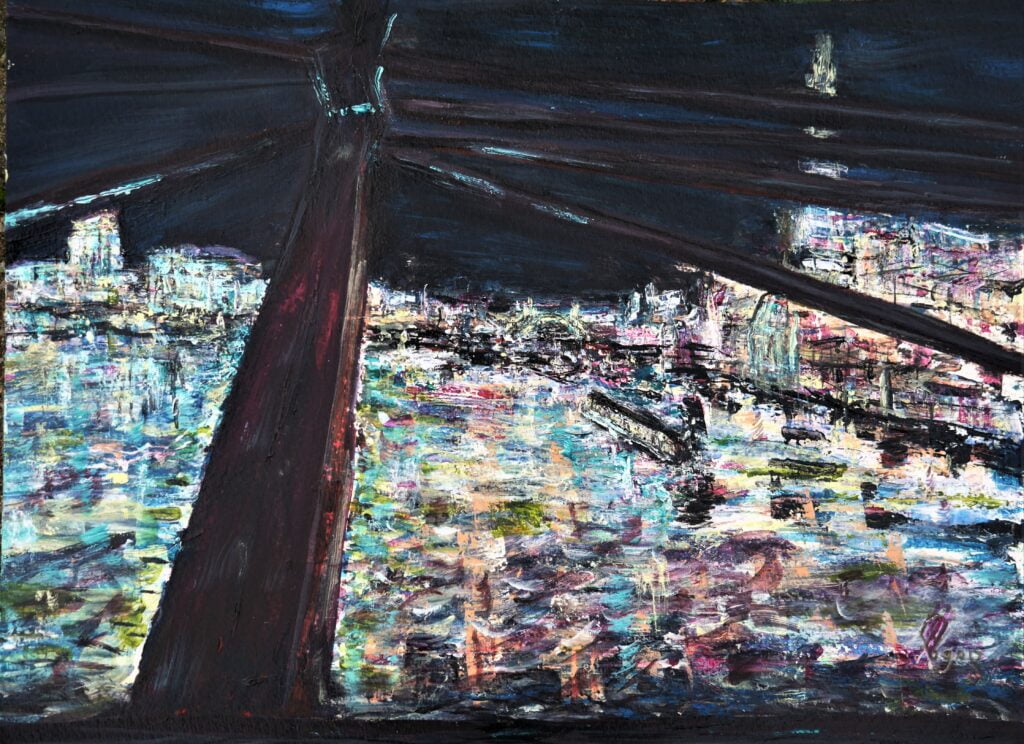 "Een nieuwe wijk aan de oude haven met muziek en cultuur. De grote appartementengebouwen steken zwart af en helder af in de nacht. Werden door mijn penseel echter vermengd met op mijn netvlies gebrand, de verwoestende beelden uit Gaza en zo ontstond dit apocalyptisch tafereel. " Spelende muzikanten vluchtend op de boot. Sauve qui peut.