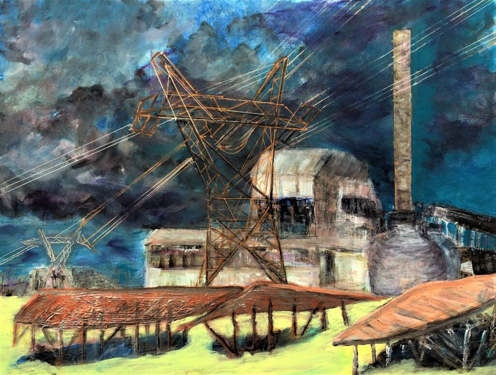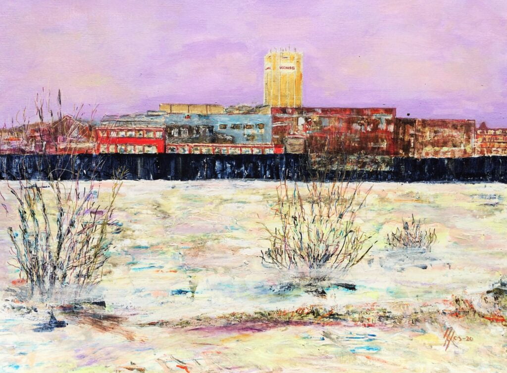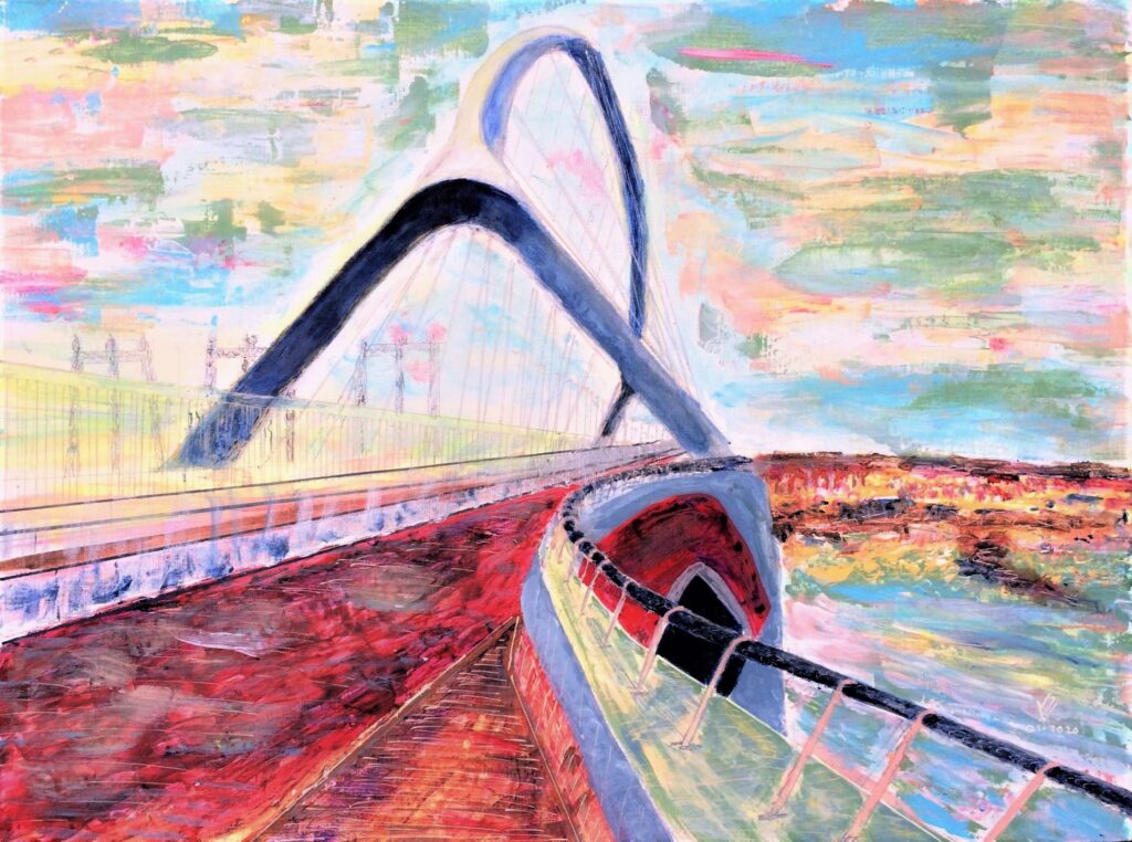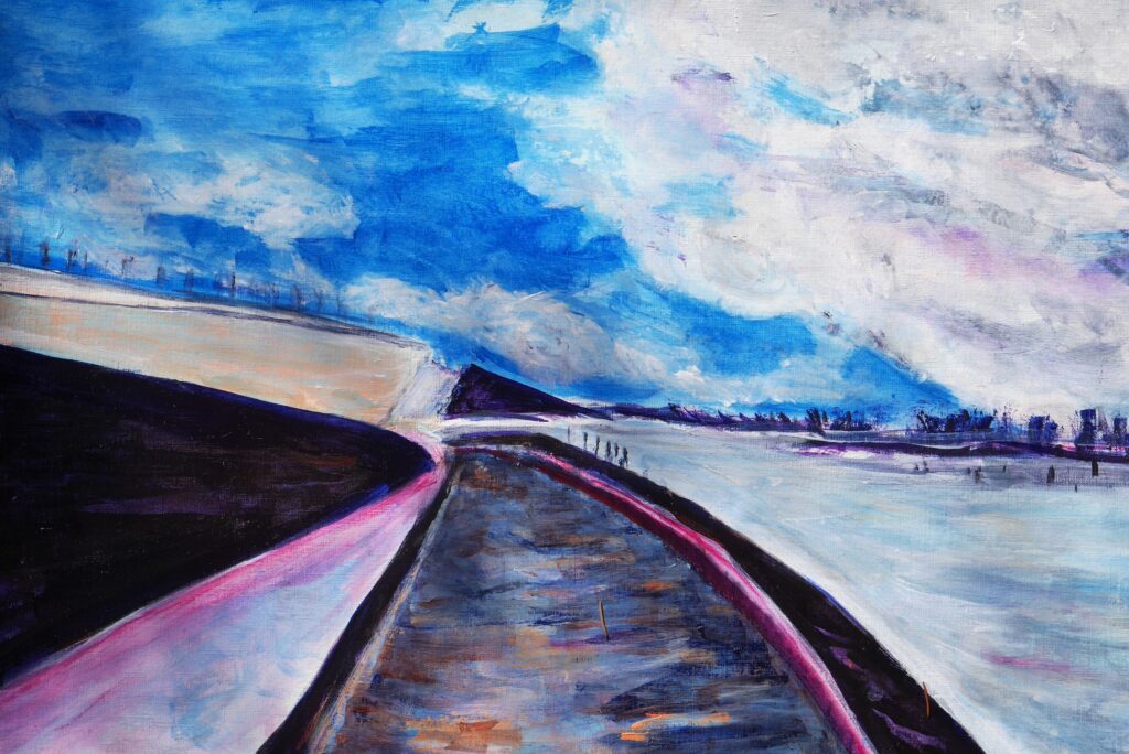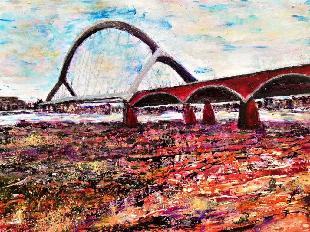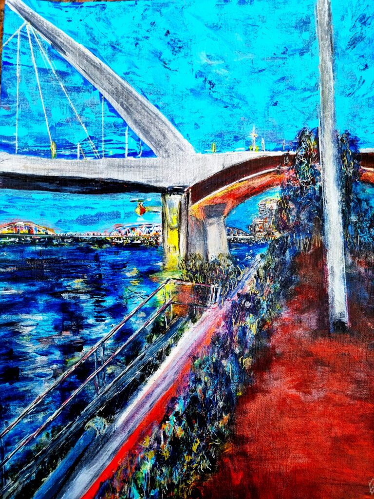 "Een nieuwe wijk aan de oude haven met muziek en cultuur. De grote appartementengebouwen steken zwart af en helder af in de nacht. Werden door mijn penseel echter vermengd met op mijn netvlies gebrand, de verwoestende beelden uit Gaza en zo ontstond dit apocalyptisch tafereel. " Spelende muzikanten vluchtend op de boot. Sauve qui peut.